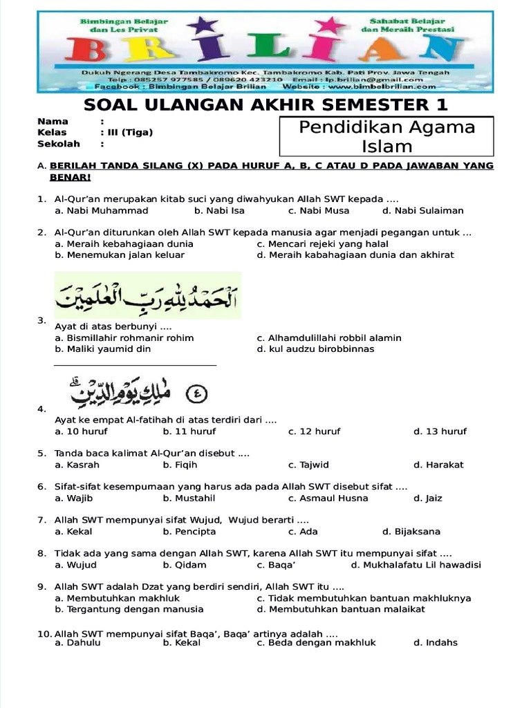 LATIHAN SOAL AGAMA ISLAM KELAS 3 SD