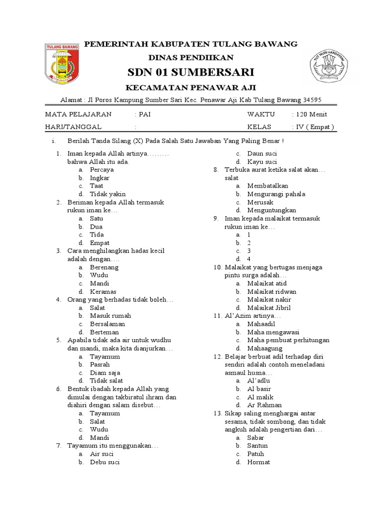 Pendidikan Agama Islam (PAI) memiliki peran krusial dalam membentuk karakter dan moralitas generasi muda. Di tingkat Sekolah Dasar (SD), khususnya kelas 4, PAI menjadi fondasi penting dalam menanamkan nilai-nilai Islam, mengenalkan rukun iman dan rukun Islam, serta menumbuhkan kecintaan terhadap Al-Qur’an dan Nabi Muhammad SAW. Soal-soal PAI kelas 4 dirancang untuk menguji pemahaman siswa tentang materi-materi esensial ini, sekaligus mendorong mereka untuk mengaplikasikan nilai-nilai tersebut dalam kehidupan sehari-hari.