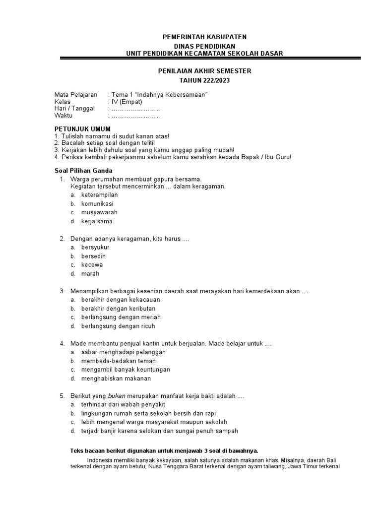 Kelas 4 merupakan jenjang penting dalam pendidikan dasar. Di kelas ini, siswa mulai diperkenalkan dengan konsep-konsep yang lebih kompleks dan mendalam. Tema 1, "Indahnya Kebersamaan," menjadi fondasi untuk memahami keberagaman Indonesia dan pentingnya hidup rukun. Artikel ini akan mengupas tuntas contoh soal kelas 4 tema 1, mencakup berbagai mata pelajaran yang terintegrasi dalam tema ini, serta memberikan tips dan trik dalam menjawab soal.
